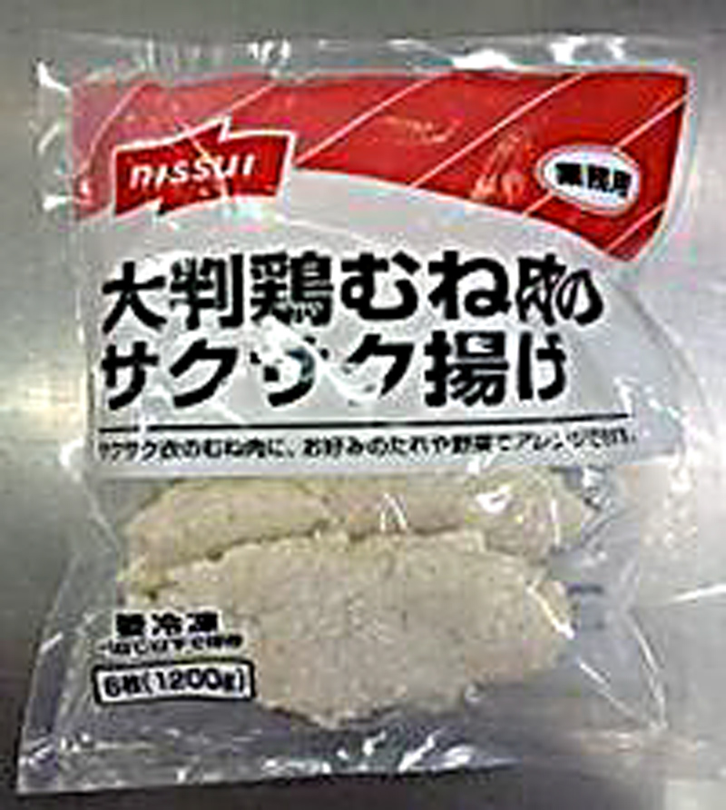 原材料 鶏肉(中国)、チキンエキス、砂糖、食塩、粉末状植物性たん白、粉末卵白、衣(小麦粉、でん粉、パン粉、加工油脂、しょうゆ、粉末加工油脂、砂糖、植物油脂)/加工でん粉、ソルビトール、調味料(アミノ酸等)、炭酸Na、炭酸水素Na、ベーキングパウダー、(一部に小麦・卵・大豆・鶏肉を含む)