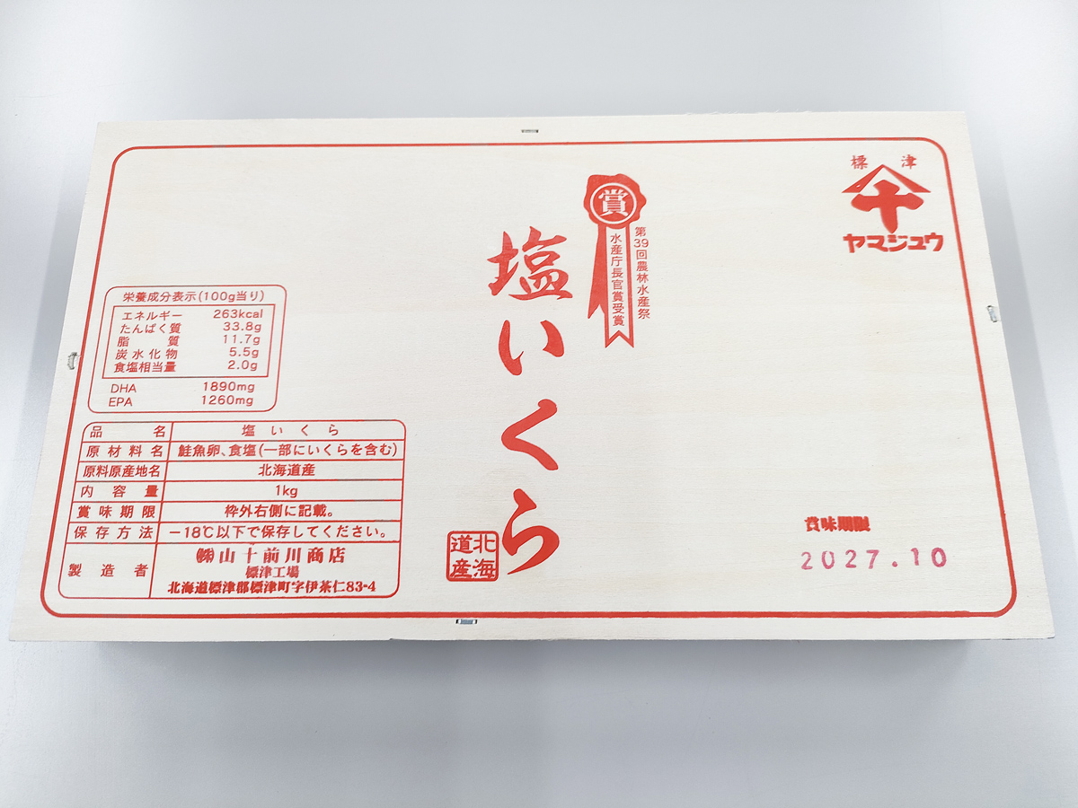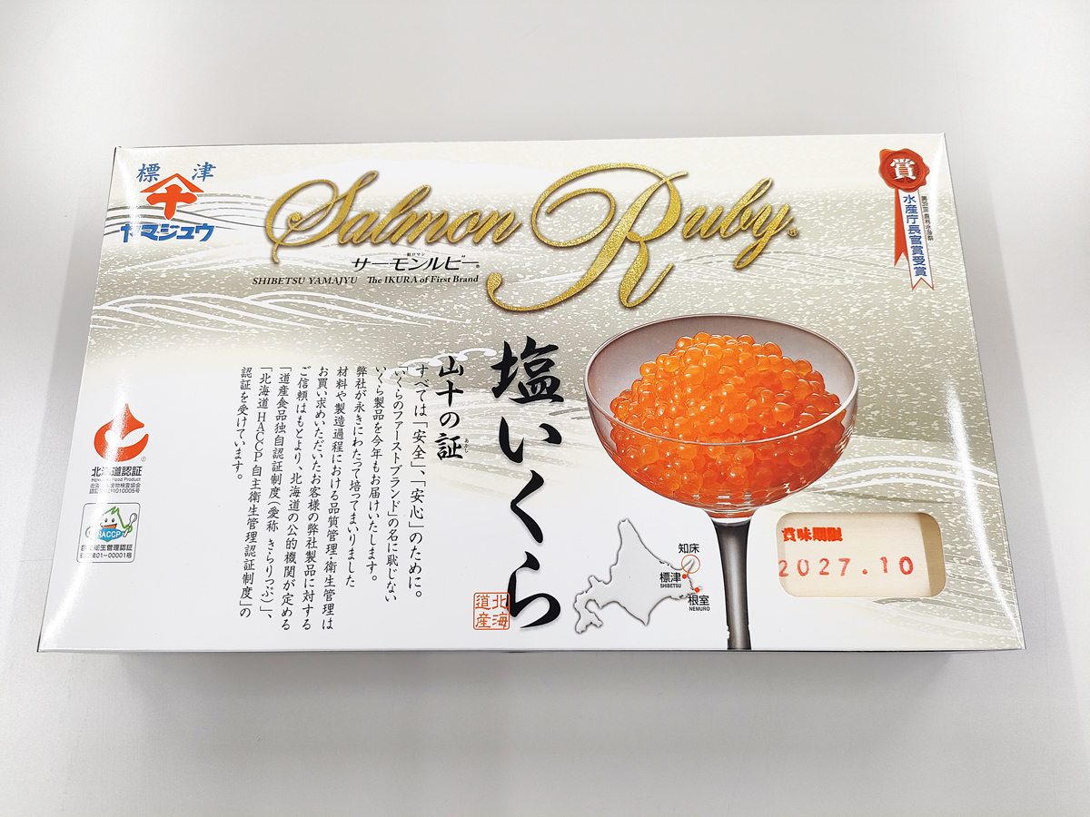 秋鮭漁獲から5時間以内に、生きている鮭卵が一粒一粒呼吸することで塩分を浸み込ませて製造しました。
